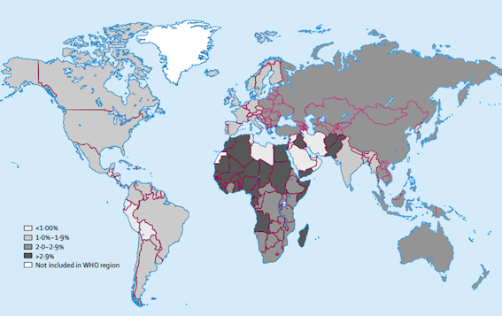 En Amérique, la séroprévalence est de 4,4 % au Nord et de 1,4 % aux USA. L'Afrique de l’Ouest et l'Afrique centrale paraissent être des zones de haute endémicité avec une séroprévalence supérieure à 9 %. L’Afrique du Sud est relativement épargnée. Au nord du continent, la séroprévalence est modérée dans le Maghreb, plus élevée en Libye.