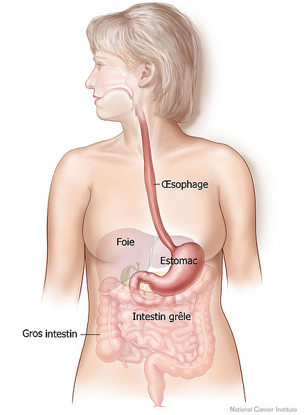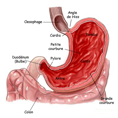 L’estomac est située entre l’oesophage et le duodénum. Il reçoit les aliments mâchés dans la bouche et déglutis dans l’eosophage. Il a une forme de J majuscule qui mesure 15 cm de haut et contient de 0,5 l à 4 litres.