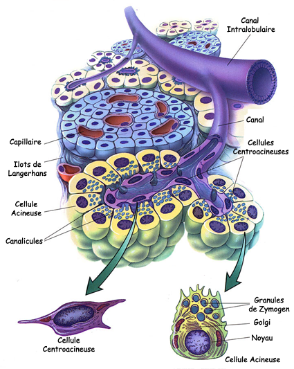 Nous verrons lors de la pancréatite chronique que les patients vont présenter une insuffisance endocrine par manque de sécrétion d'Insuline et donc un diabète et une insuffisance exocrine qui va entraîner des diarrhées graisseuses ou stéatorrhées