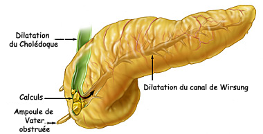 S'il existe d'emblée une dilatation du cholédoque (voie biliaire principale) avec la visualisation d'un calcul enclavé dans le bas cholédoque (Figure n°2) : le diagnostic est facile. Dans 80 % des cas le calcul sera expulsé spontanéement et la pancréatite pourra se résorber. En revanche, si le calcul reste bloqué en bas du cholédoque il faudra réaliser une extraction de celui-ci par la réalisation d'une C.P.R.E (Figure n°3).