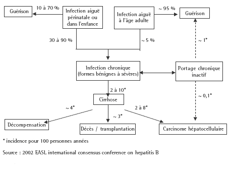 L’évolution et le pronostic de l’infection par le virus de l’hépatite B sont fortement influencés par l’âge au moment de la contamination, le taux de multiplication du virus et l’état des défenses immunitaires.