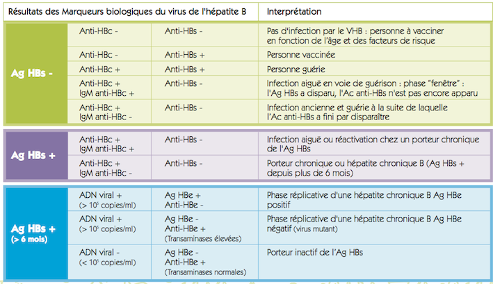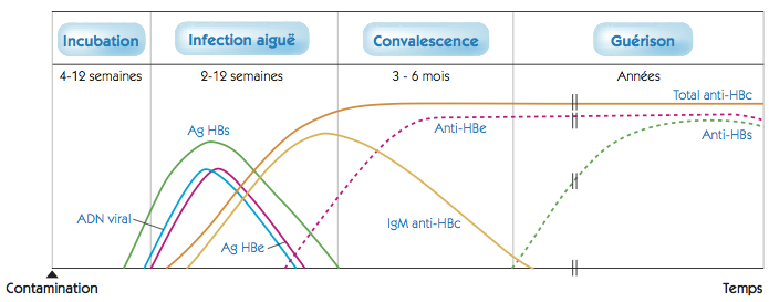 Sur le plan biologique il existe alors une disparition de l’AgHBs et des anticorps anti-HBc de classe IgM et une apparition d’anticorps anti-HBs et anti-HBc de classe IgG.