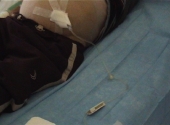 Dans la plupart du temps une perfusion dans la veine du pli du coude droit est mis en place par un(e) infirmier(e), car il faut compenser le volume enlevé d'ascite par de l'albumine° à 20% qui est administrée par voie veineuse