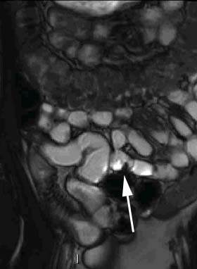 Figure n° 6 : Sténose du grêle (flèche) vu par Entero-IRM