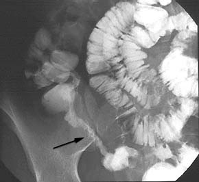 Figure n° 4 : Sténose (Flèche) de l'iléon sur un transit du grêle