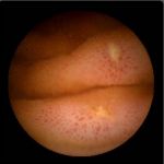 Lors de ces examens d’endoscopies, des lésions endoscopiques évocatrices de maladie de Crohn peuvent être visibles (Figure n°1 et 2) : des ulcérations apthoïdes, des ulcérations en carte de géographie, des ulcérations en rails.