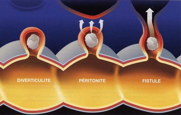 Une péritonite peut également apparaître, soit par perforation secondaire d’un abcès péri-diverticulaire, soit par perforation directe dans la cavité péritonéale.
