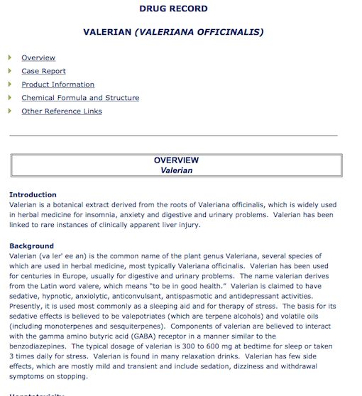 Si nous prenons un exemple avec la Valériane (herbe aux chats), le site Livertox nous propose une synthèse des hépatoxités secondaire à la valériane, une étude de cas, une information sur le produit, la formule chimique et la structure de la valériane et 31 liens de référence bibliographiques.