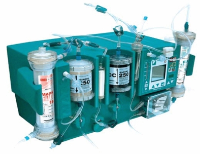 figure 4. Le moniteur Mars® avec les trois circuits : le circuit sang extracorporel, le circuit albumine et le dialysat. (Source : Hospal)