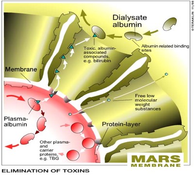 Le système MARS® est un procédé de dialyse hépatique qui utilise le pouvoir de fixation de l’albumine pour éliminer les substances toxiques ayant une forte affinité à l’albumine accumulées dans le sang du fait de l’incapacité du foie à assurer sa fonction de détoxification. Le système MARS® est conçu pour éliminer les toxines de bas et moyens poids moléculaires, inférieurs à 50 kDa libres ou fixées à l’albumine. Cette élimination est réalisée grâce à la membrane MarsFlux® décrite ci-dessus et grâce à l’albumine humaine agissant comme absorbant sélectif pour le transport des toxines (figure 2).