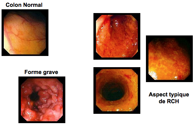 Lors de ces examens d’endoscopies, des lésions endoscopiques évocatrices de RCH peuvent être visibles (Figure n°1) qui est une atteinte continue, commençant dès la jonction ano-rectale, s’étendant plus ou moins loin vers l’amont et s’interrompant de façon assez brusque. L’existence d’un deuxième foyer inflammatoire caecal périappendiculaire est classique. Le rectum peut être relativement moins atteint que les segments d’amont, spontanément ou du fait de l’utilisation récente de lavements.